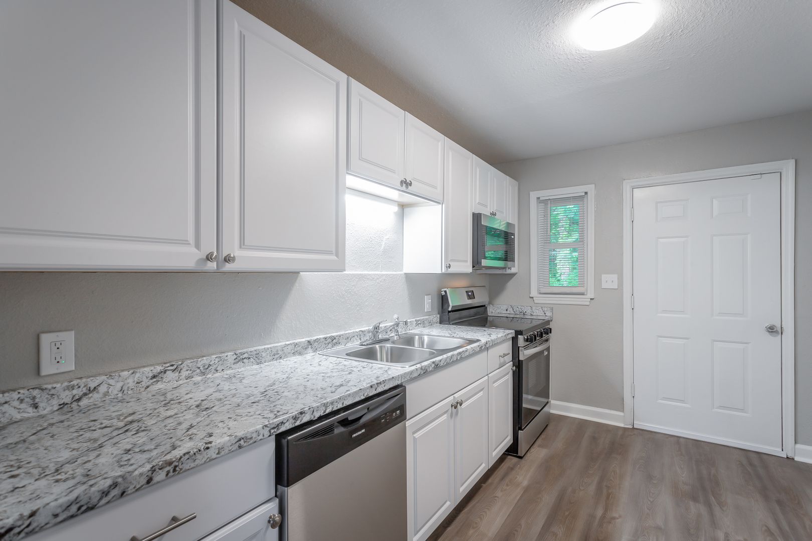 The kitchen has been fully refreshed with modern white cabinetry, granite-style countertops, stainless steel appliances, and updated fixtures, creating a clean and functional space for everyday living. The layout flows easily into the main living area, which is filled with natural light from large windows.