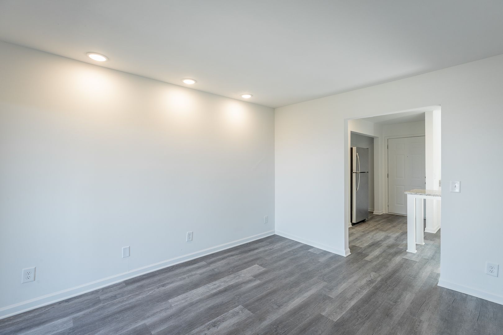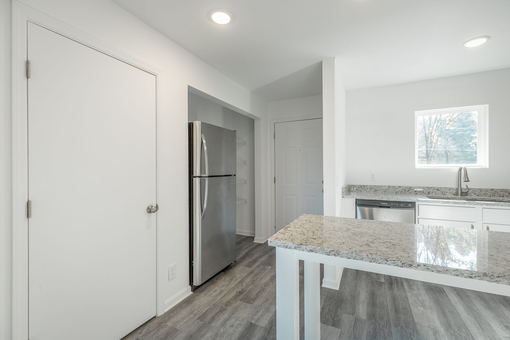 The galley kitchen includes a refrigerator, dishwasher, and range, along with ample cabinet storage for everyday cooking. The living room provides plenty of space to relax or entertain, and open on-site parking is available for added convenience.